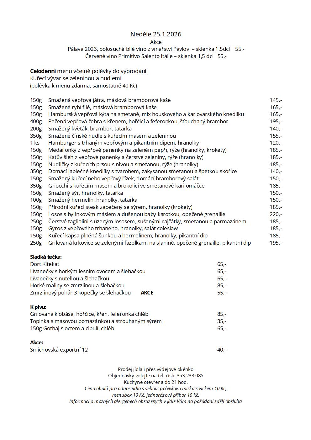 Nabízíme vyhlášenou českou kuchyni a velký výběr točených piv. Dbáme na čerstvost veškerých jídel, a proto Vám naši kuchaři připravují každý den nové menu. Zároveň jsme i výrobce poctivých domácích knedlíků, které si můžete zakoupit i s sebou.