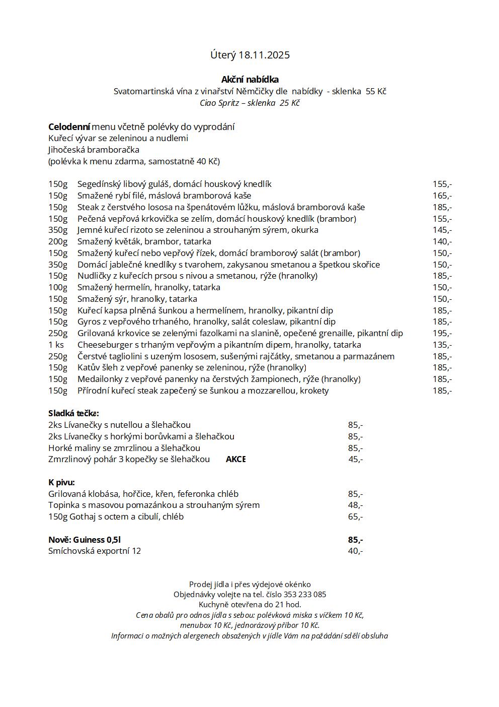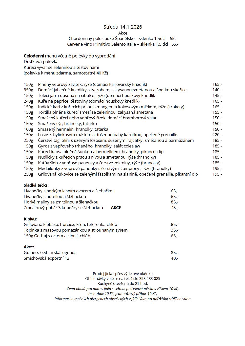 Nabízíme vyhlášenou českou kuchyni a velký výběr točených piv. Dbáme na čerstvost veškerých jídel, a proto Vám naši kuchaři připravují každý den nové menu. Zároveň jsme i výrobce poctivých domácích knedlíků, které si můžete zakoupit i s sebou.